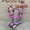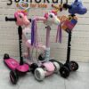 В отличии от мини самоката, сзади установлено два колеса. Так делают для повышенной устойчивости самоката и уменьшение нагрузки на платформу. Также, все колеса у этой модели светятся во время движения. Светящиеся колеса особенно заметны и эффектны в вечернее время.