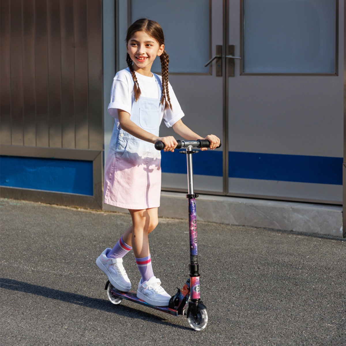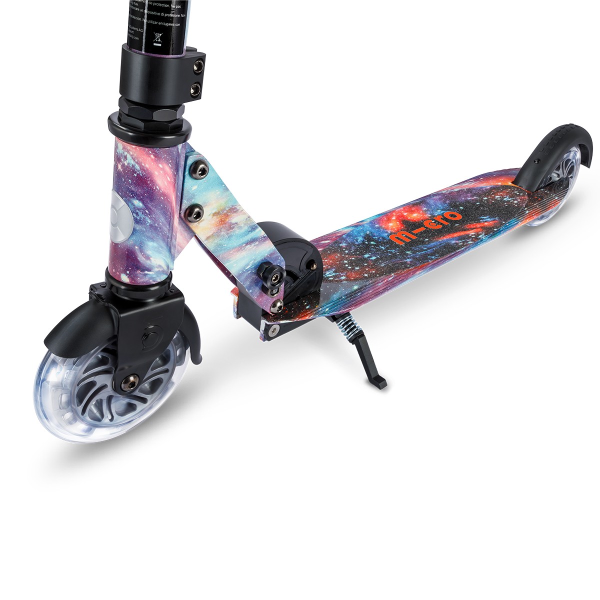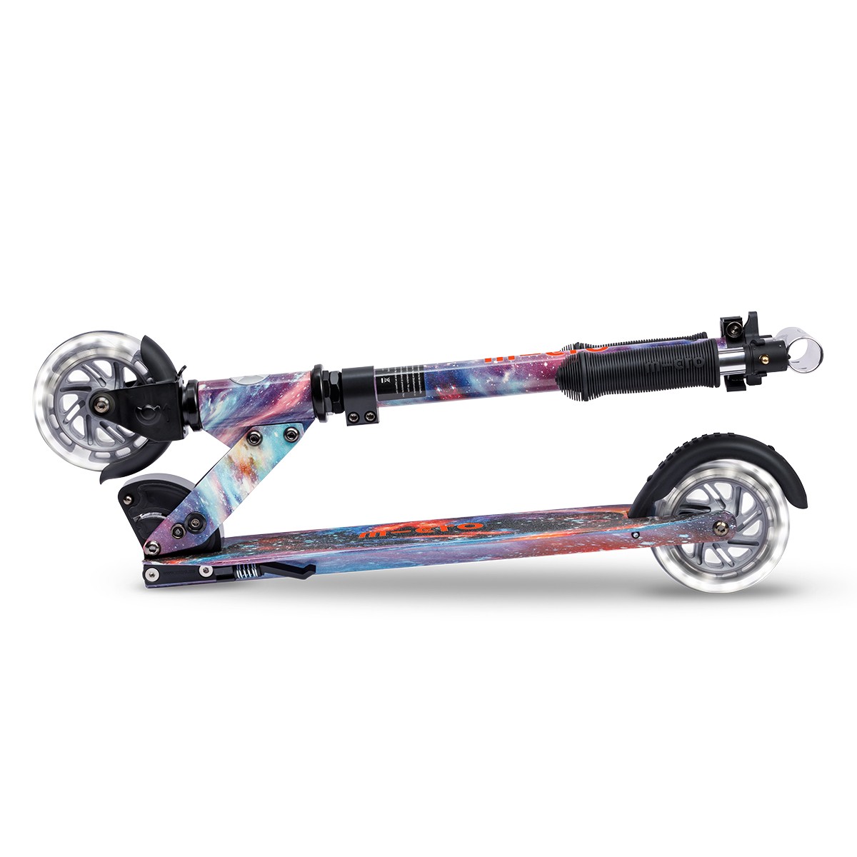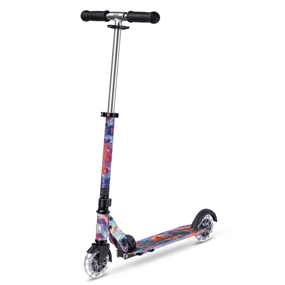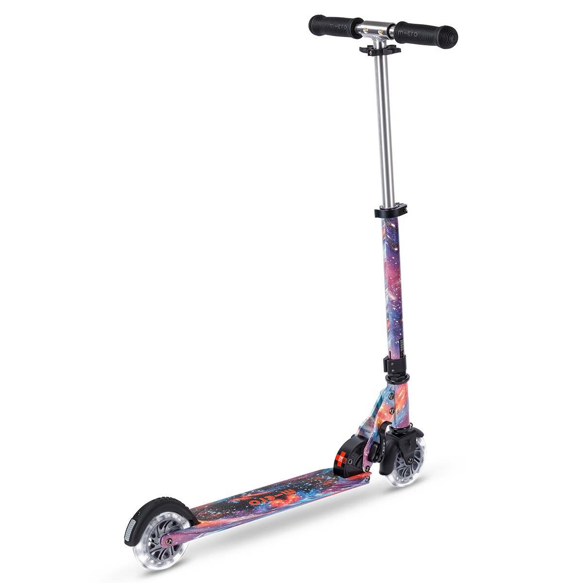 Самокат MICRO серії ‘Sprite Glow LED Art Collection’ — КОСМОС — досконалий та міцний двоколісний самокат. Він оснащений колесами, що світяться, та складною рамою.
